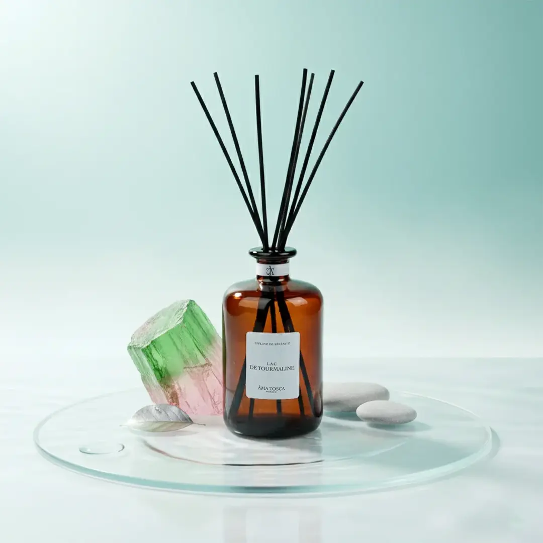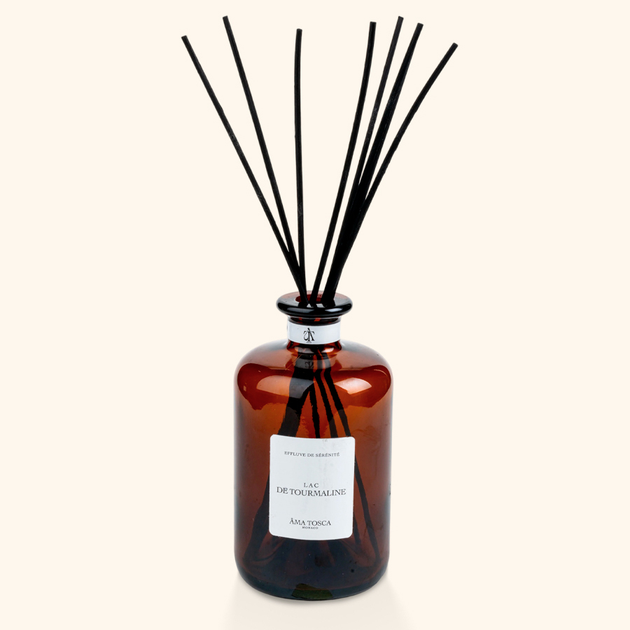 Parfum d’intérieur 500ml conçu à Grasse d’origine naturelle + 8 roseaux pour libérer le parfum en continu pendant environ 3 mois.