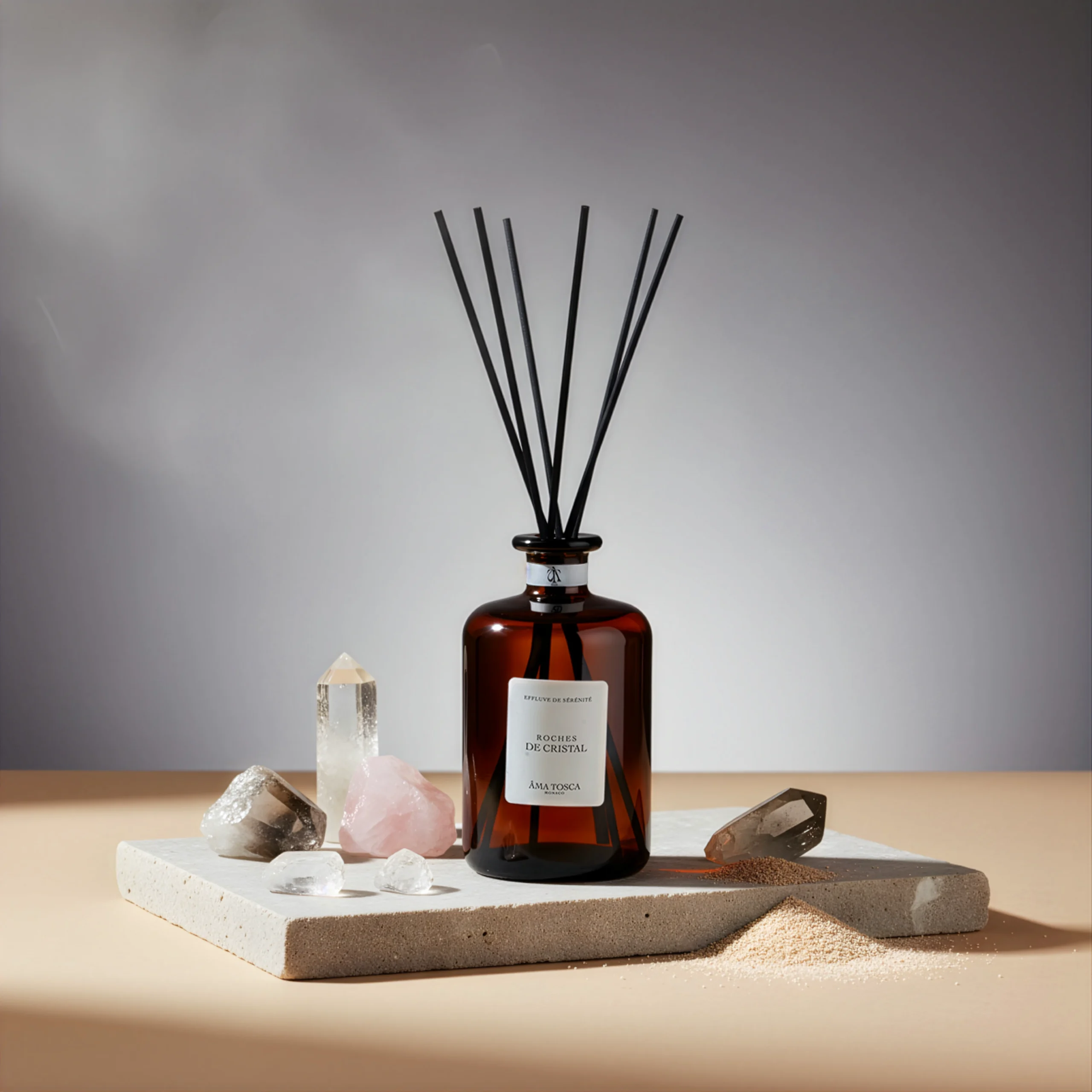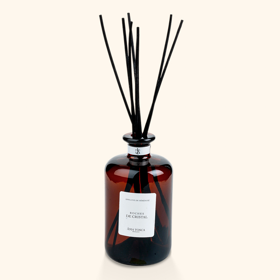 Parfum d’intérieur 500ml conçu à Grasse d’origine naturelle + 8 roseaux pour libérer le parfum en continu pendant environ 3 mois.